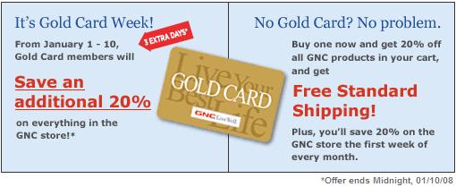 Drugstore.com Gnc Product save an additional 20% with GNC gold card. Offer ends Midnight, Jan 10, 2008