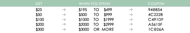 Get $300 gift card when you spend $3000+ coupon code 1C026A Expires : May 26, 2008